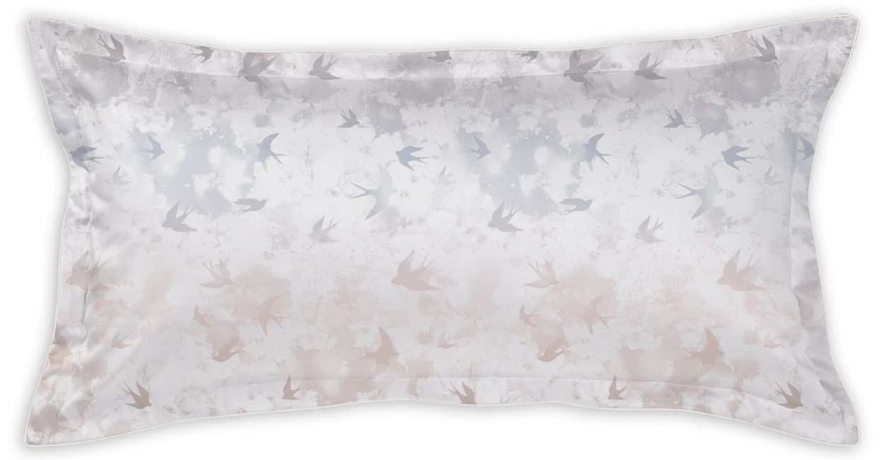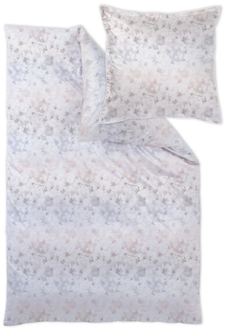 - Schlafen wie unter freiem Himmel: Buntgewebte Bettwäsche mit Hintergrund in sanftem Farbverlauf zwischen Taupe, Beige und Bleu vor dem Vögel friedlich umeinander fliegen