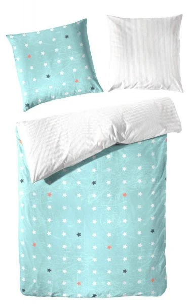 - Perkal Wendebettwäsche mit Sternen auf türkisfarbenem Grund auf der Vorderseite und grau-weißen Streifen auf der Rückseite